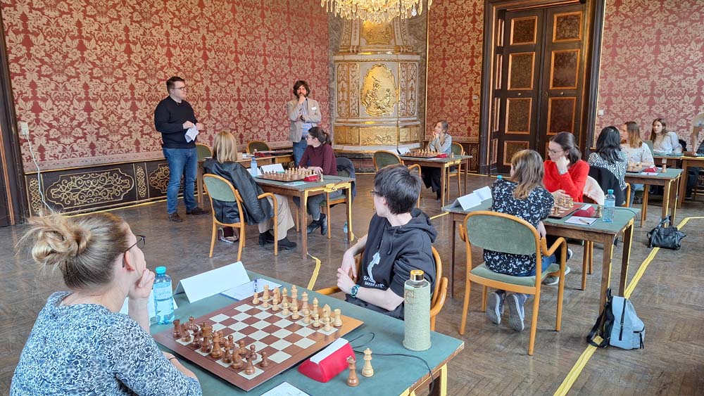 Michael Stöttinger, President of the Austrian Chess Federation and organiser of the event, personally opens the second round of the Eva Moser Memorial at Palais Attems in Graz before he has to leave the city for a few days.